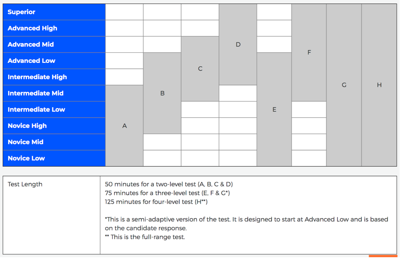 【”50 minutes for a two-level test (A, B, C & D); 75 minutes for a three-level test (E, F & G*); 125 minutes for a four-level test (H**). ” 】