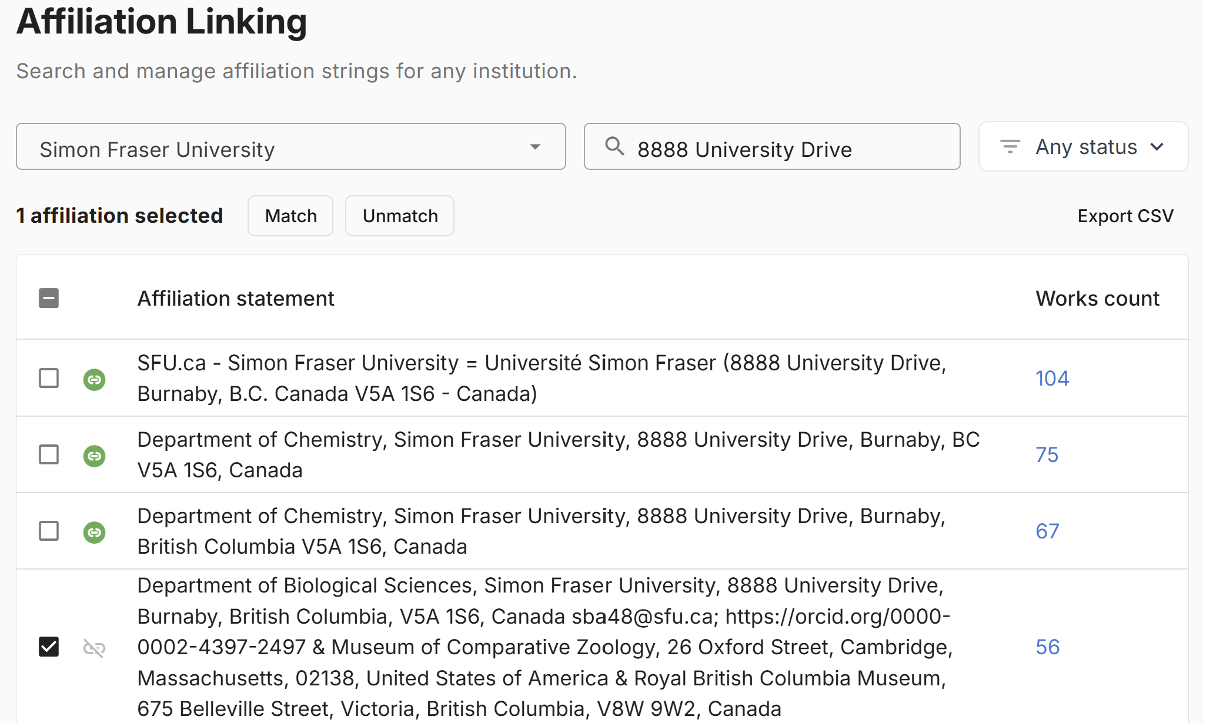 - Affiliation Editor interface showing affiliation linking tool