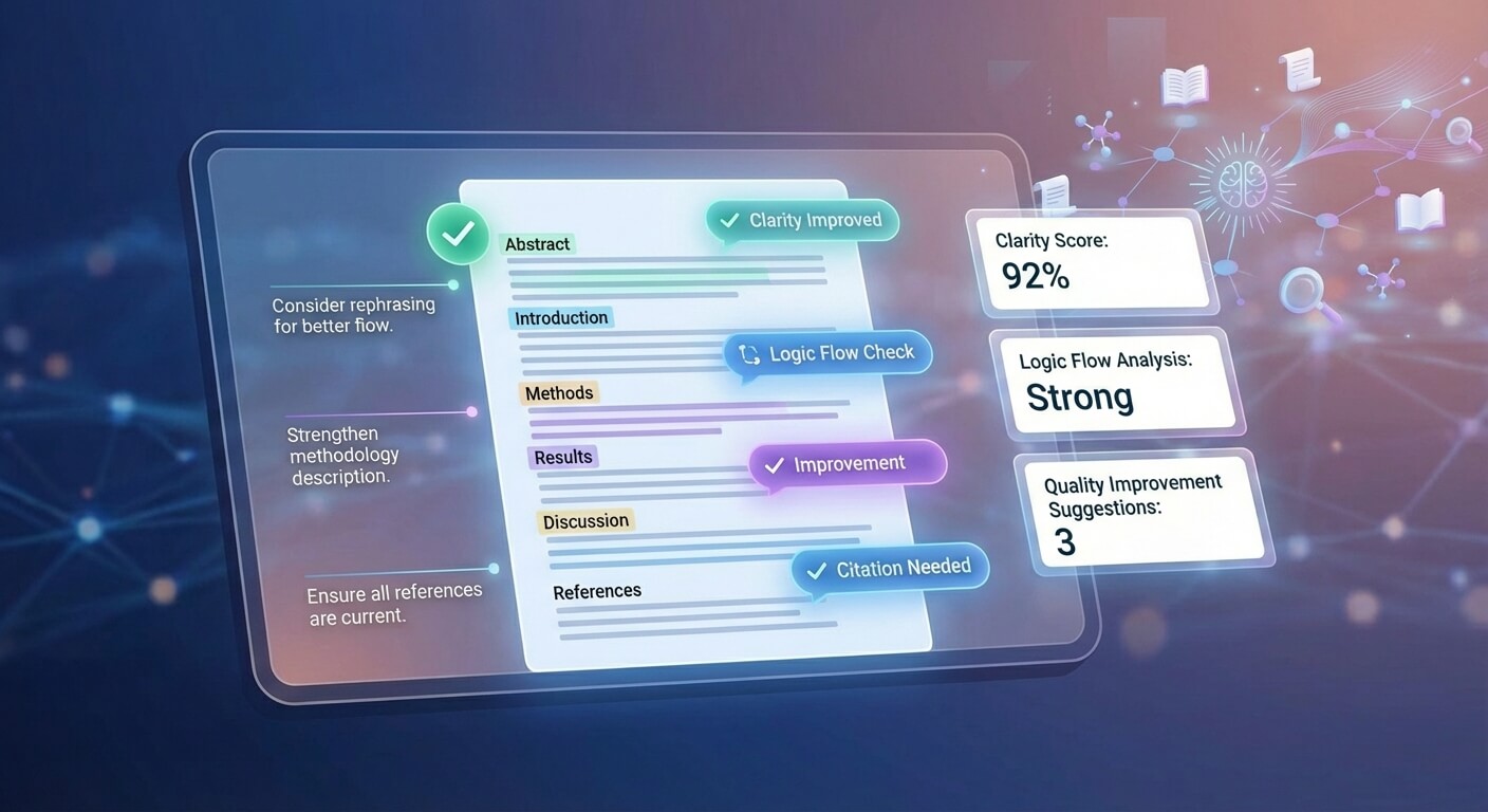 AI Reviewer Agentが、PDF(最大20MB/50頁)をアップロードするだけで、6章立て(抄録~引用)で網羅的に評価レポートを生成。投稿前に論文の弱点を可視化し、質を高めます。