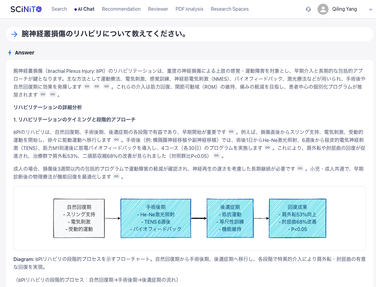 SCiNiTOは、OpenAlexの膨大な学術データベースとAI技術を統合した、最先端の研究プラットフォームです。論文の高度な検索やAIチャットによる研究支援、最適な投稿先ジャーナルの推薦、AIによる原稿レビューなど、研究の全段階を一つの場所でシームレスにサポートします。これにより、研究者は検索から執筆、発表までのプロセス全体を効率化できます。