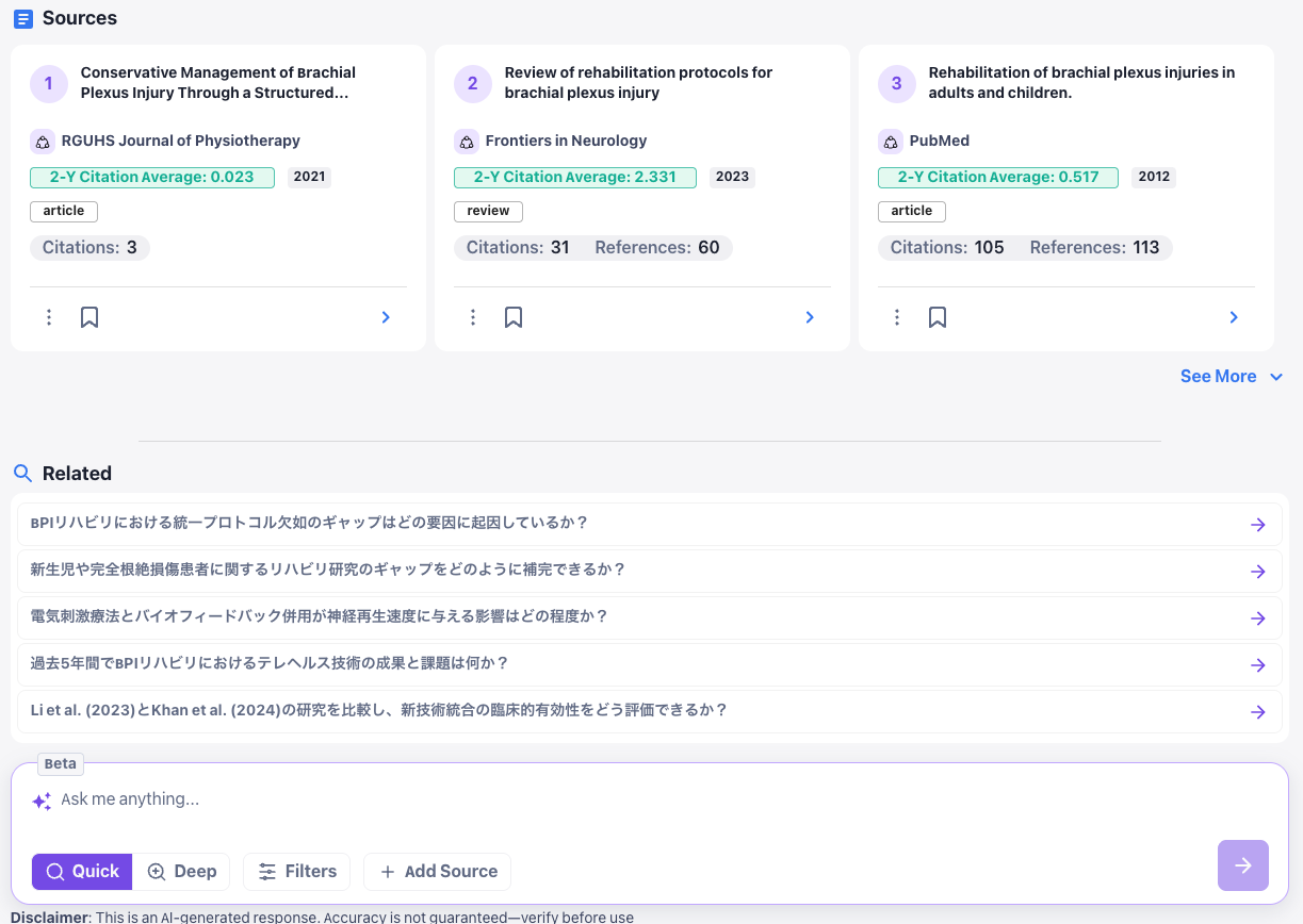 ・自然言語での検索:質問を入力するだけで、引用付きの関連文献や研究動向をAIが提示します。
