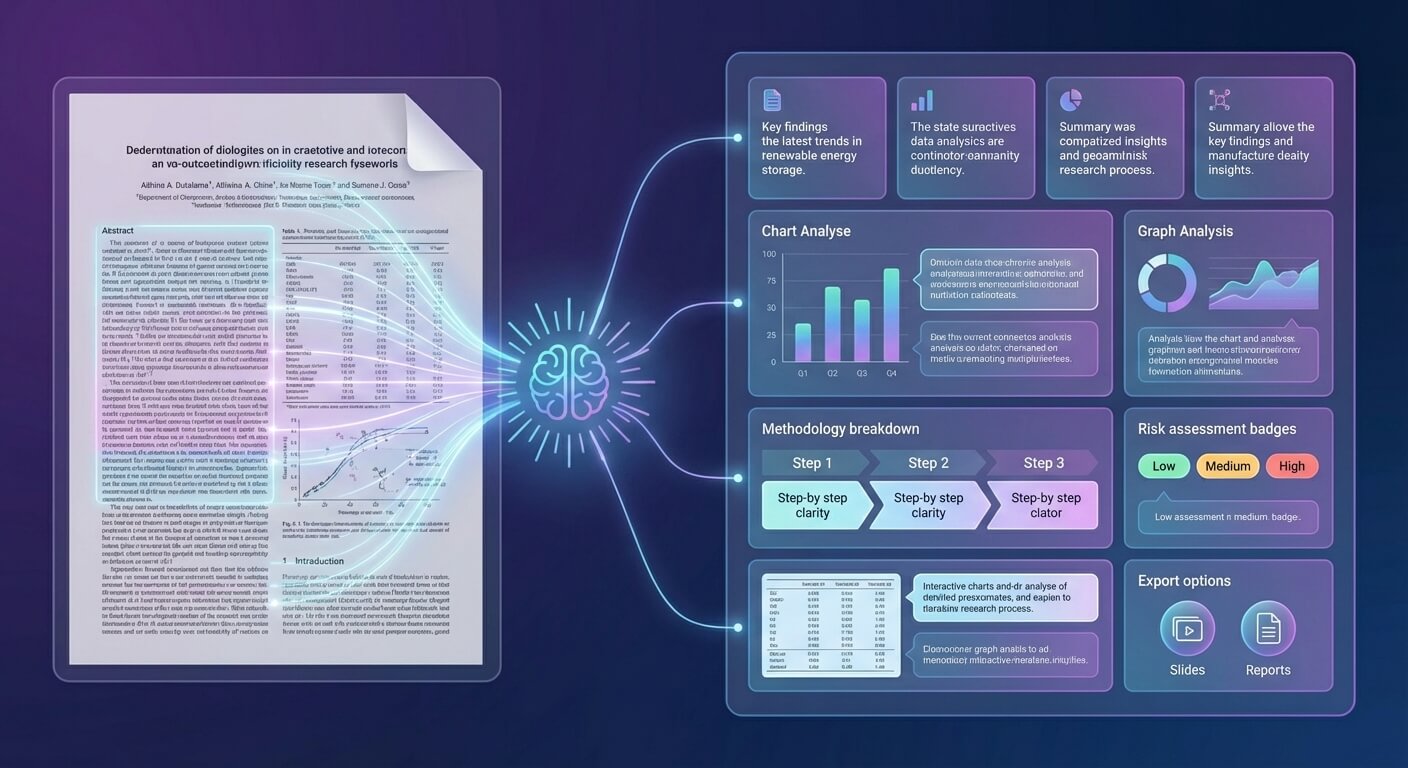 研究論文などのPDFをアップロードするだけで、AIが内容を自動で分析し、重要なポイントを瞬時に要約します。複雑な図や研究手法も分かりやすく解説し、レポート作成などに活用できる形で整理されたインサイトを提供します。