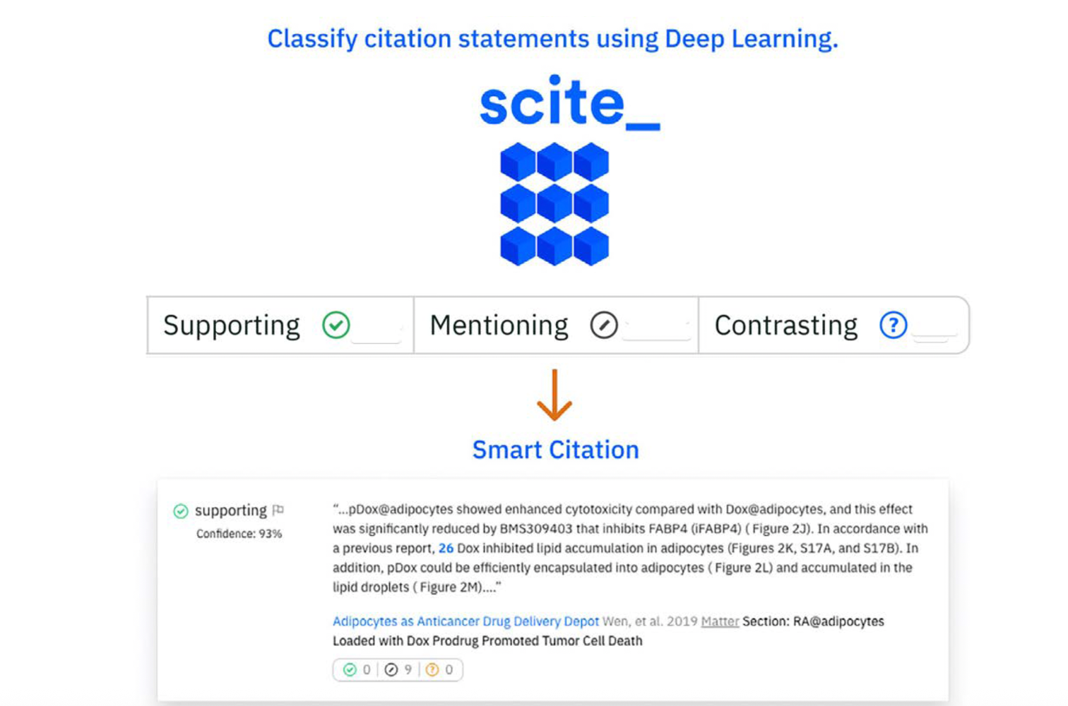 「スマートサイテーション」は、AI(⼈⼯知能)を活⽤したScite独⾃の引⽤⽂献情報です。⽂献の引⽤評価をSupporting, Mentioning, Contrastingという三つのカテゴリに分類してスコアを表⽰しています。分類は、ディープラーニングを使⽤して⼤量の⽂献を学習したAIにより⾏われています。また、⽂献の引⽤箇所の前後の⽂章を⾃動的に抽出するため、利⽤者⾃⾝が⽂献がどのように評価されているのかを、論⽂全体に⽬を通すことなく簡単にチェックすることができます。