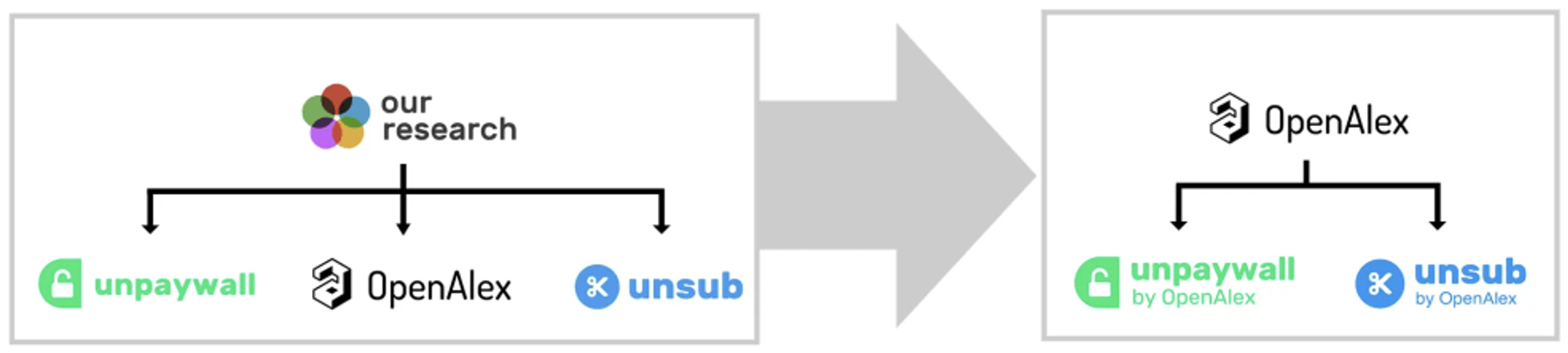 For years, we’ve been working under the name OurResearch. That name sat at the top of our org chart, with three child projects under it: OpenAlex, Unpaywall, and Unsub.